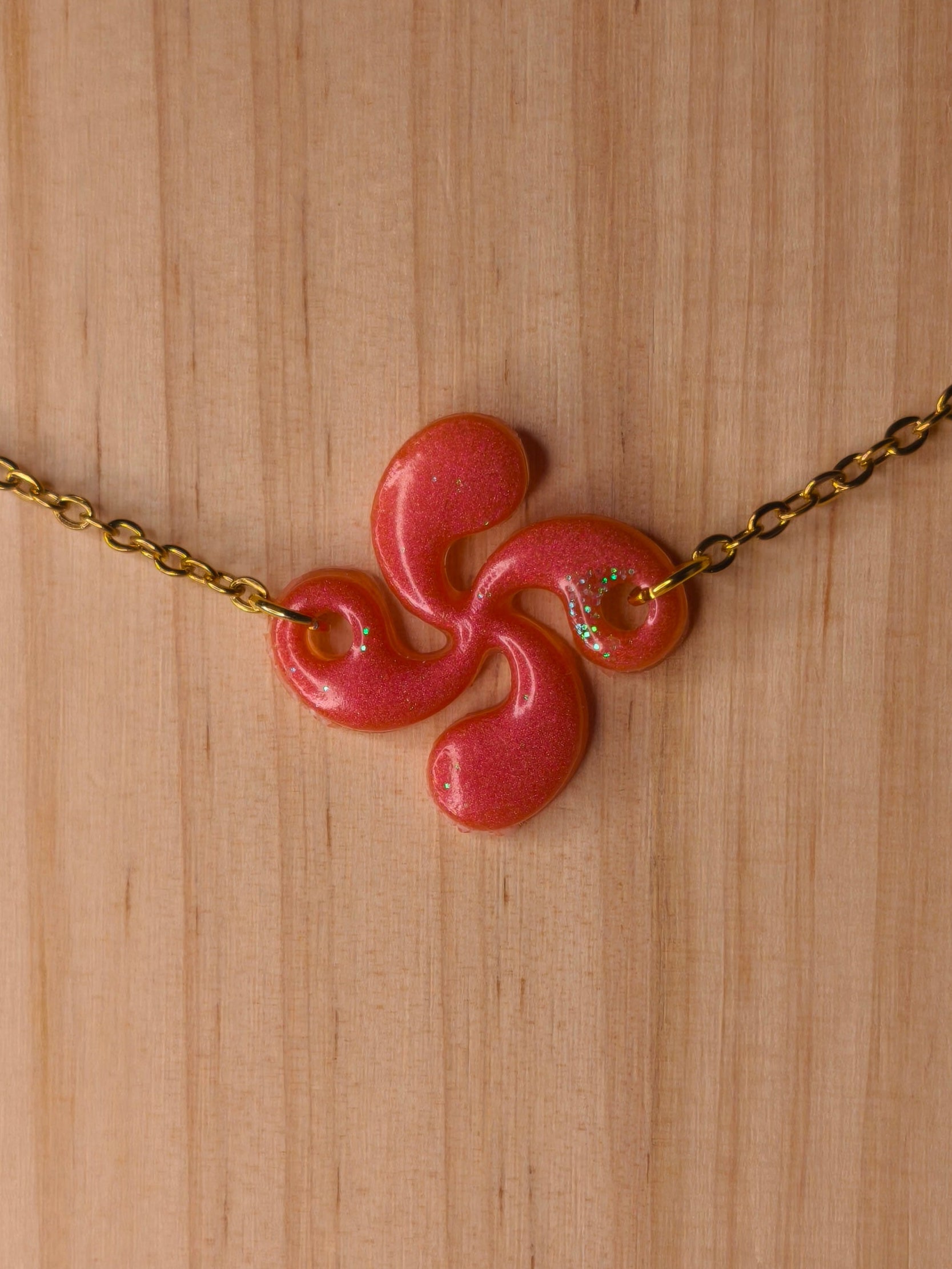 Un bracelet, où la Croix Basque rouge irisé capte la lumière et habille le poignet