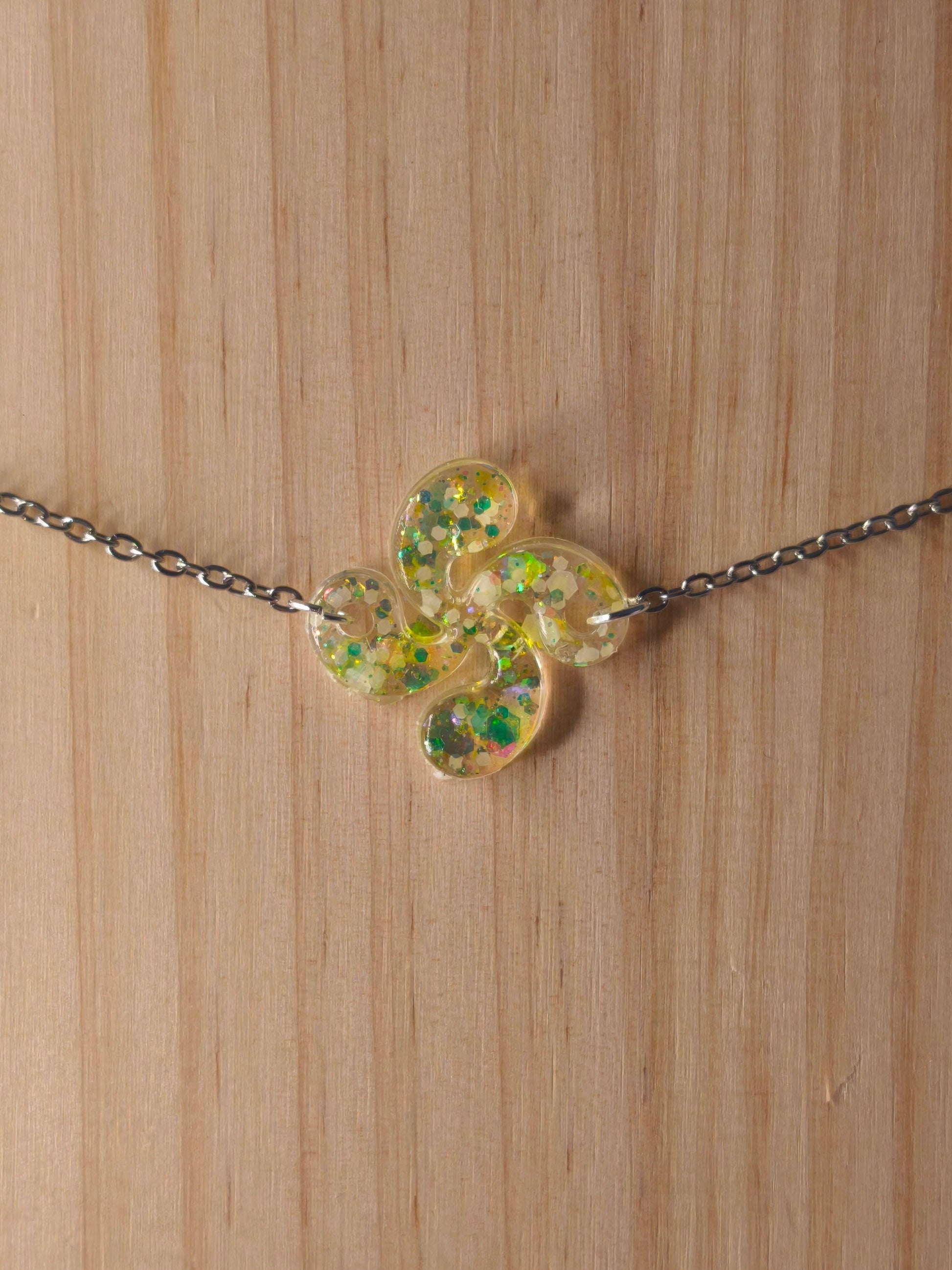Bracelet orné d’une croix basque jaune à paillettes phosphorescentes, bijou solaire au poignet