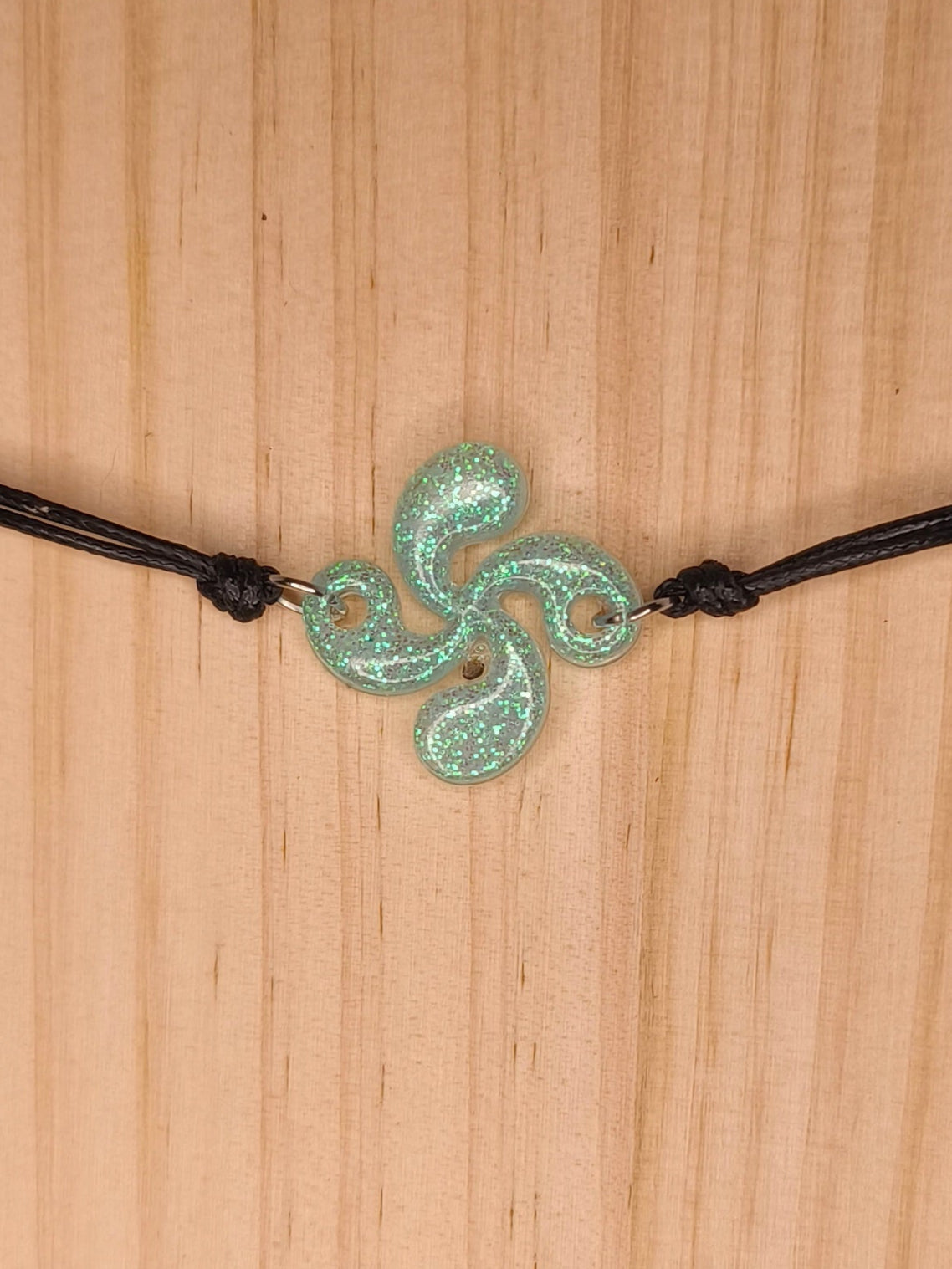 Le bracelet orné d’une croix basque en turquoise à paillettes fines habille le poignet d’une élégance discrète