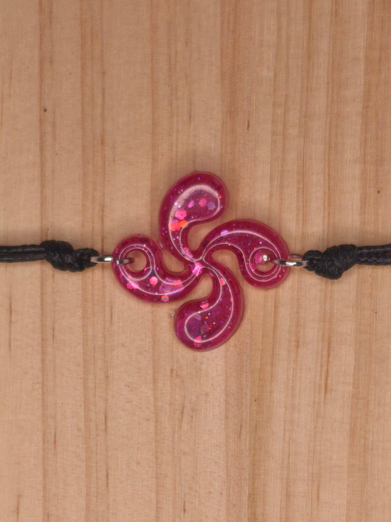 Le bracelet avec croix basque en prune à paillettes habille le poignet d’une touche scintillante et raffinée