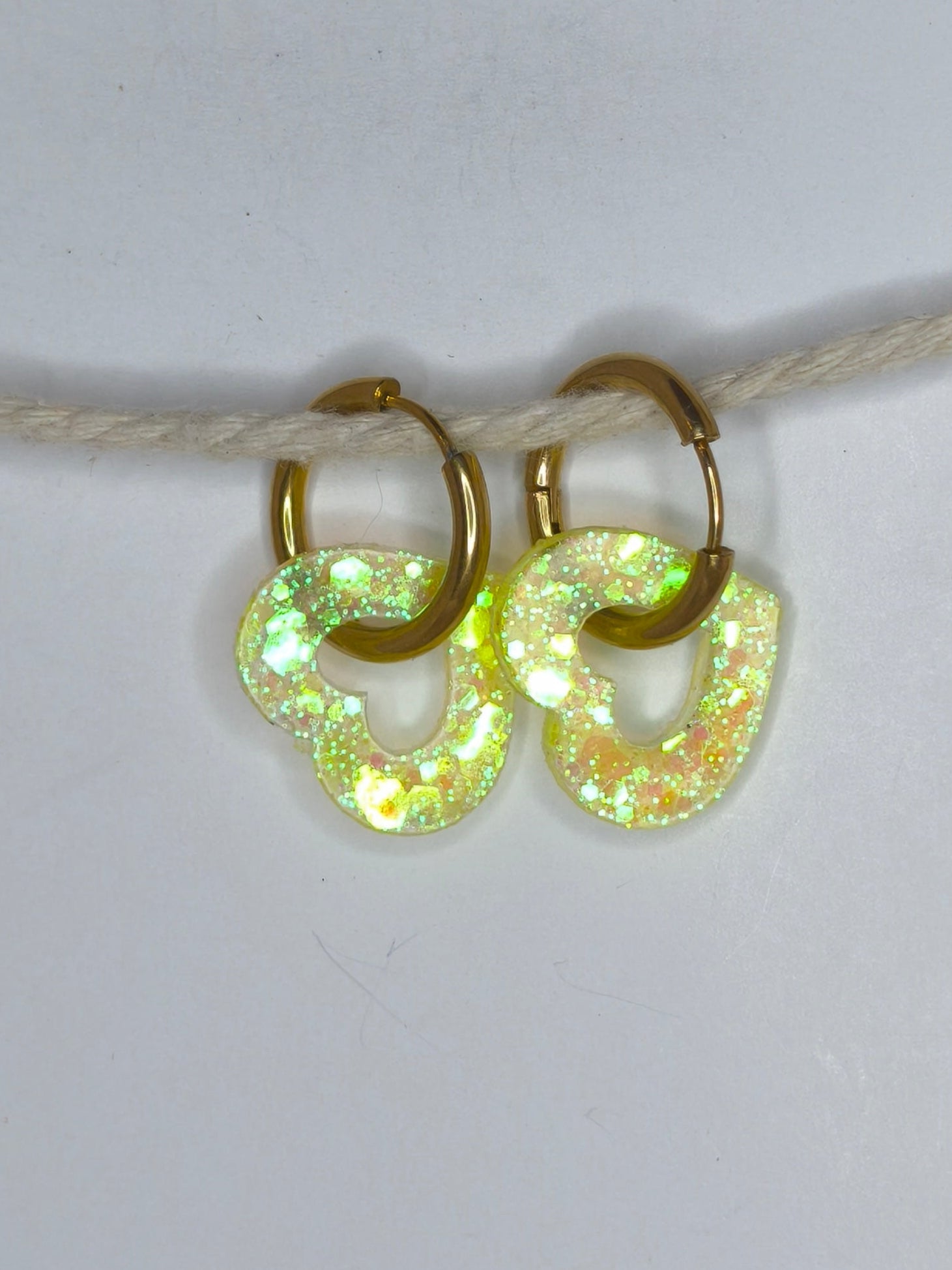 Un cœur jaune fluo translucide parsemé de paillettes irisées, symbole de douceur et de tendresse