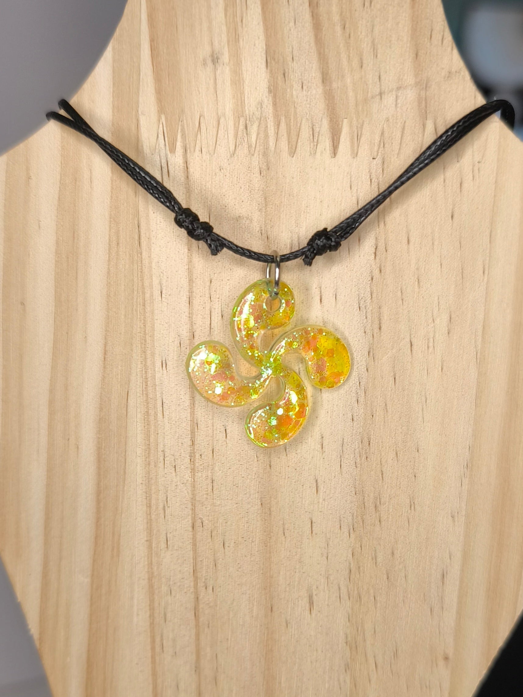 Un collier jaune fluo translucide avec paillettes irisées qui suspend la Croix Basque près du cœur, pour un style poétique et lumineux inspiré de Cambo-les-Bains