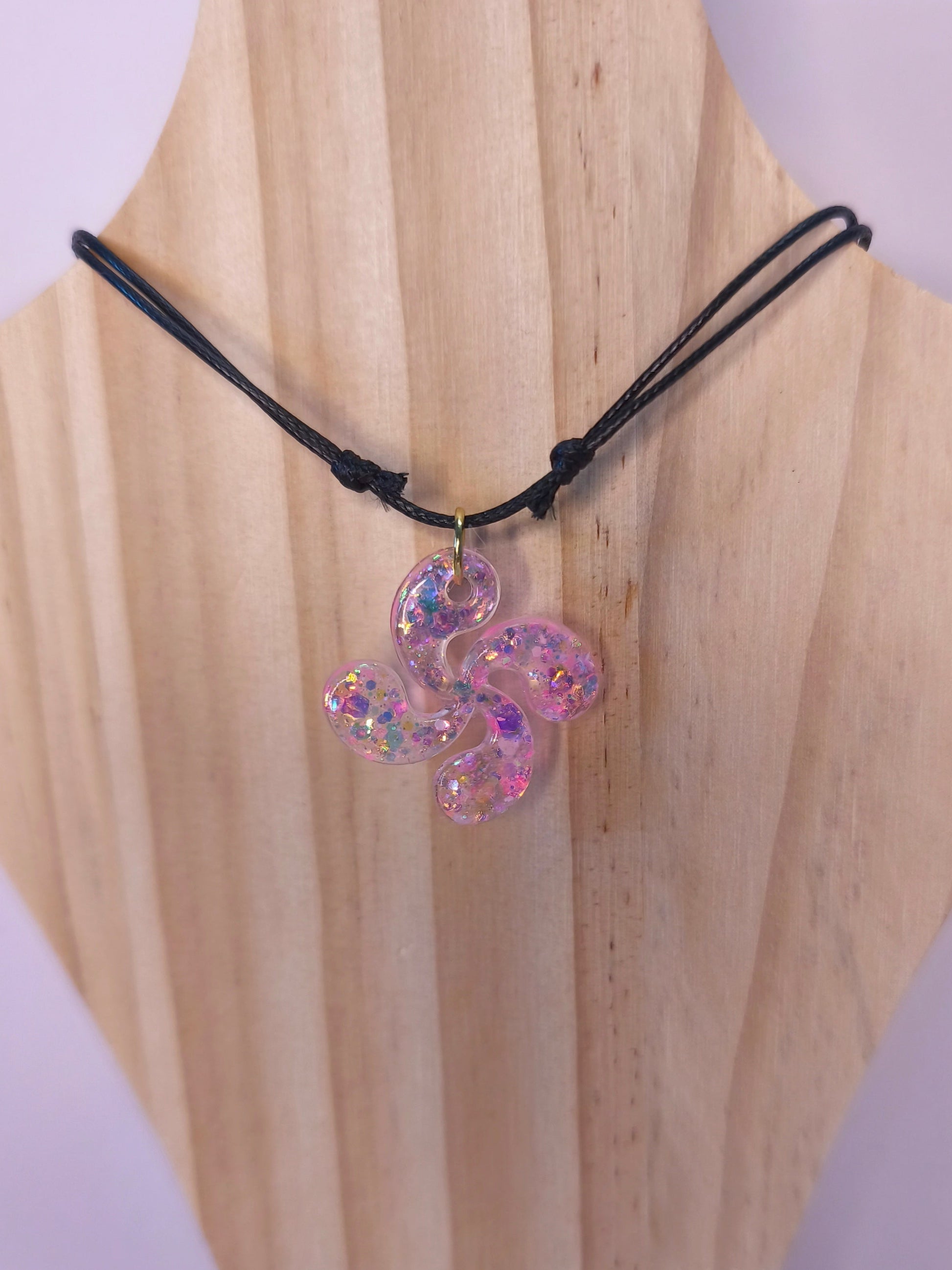 Un collier transparent avec paillettes luminescentes roses qui suspend la Croix Basque près du cœur, pour un style poétique et lumineux inspiré d’Arrosa