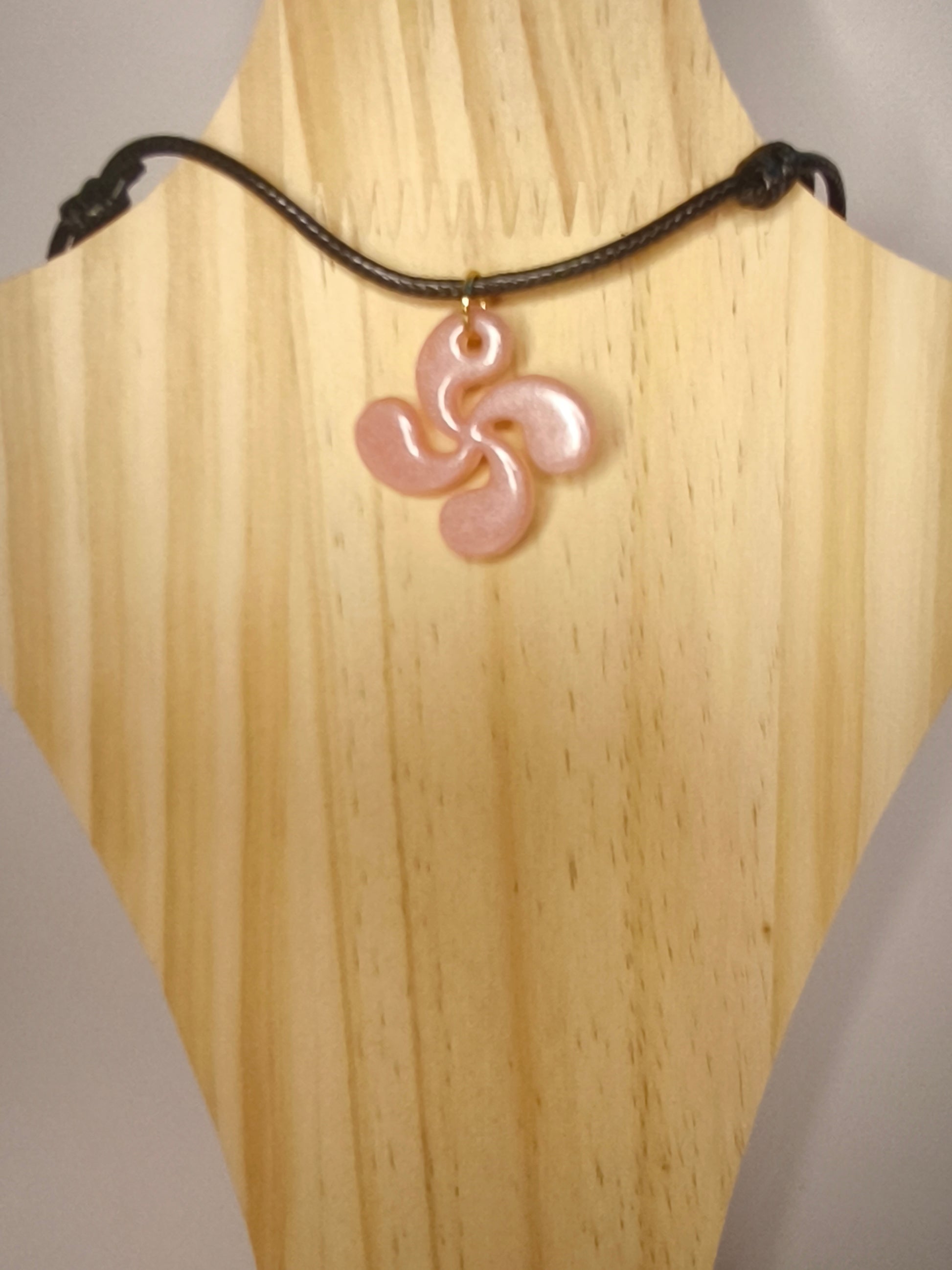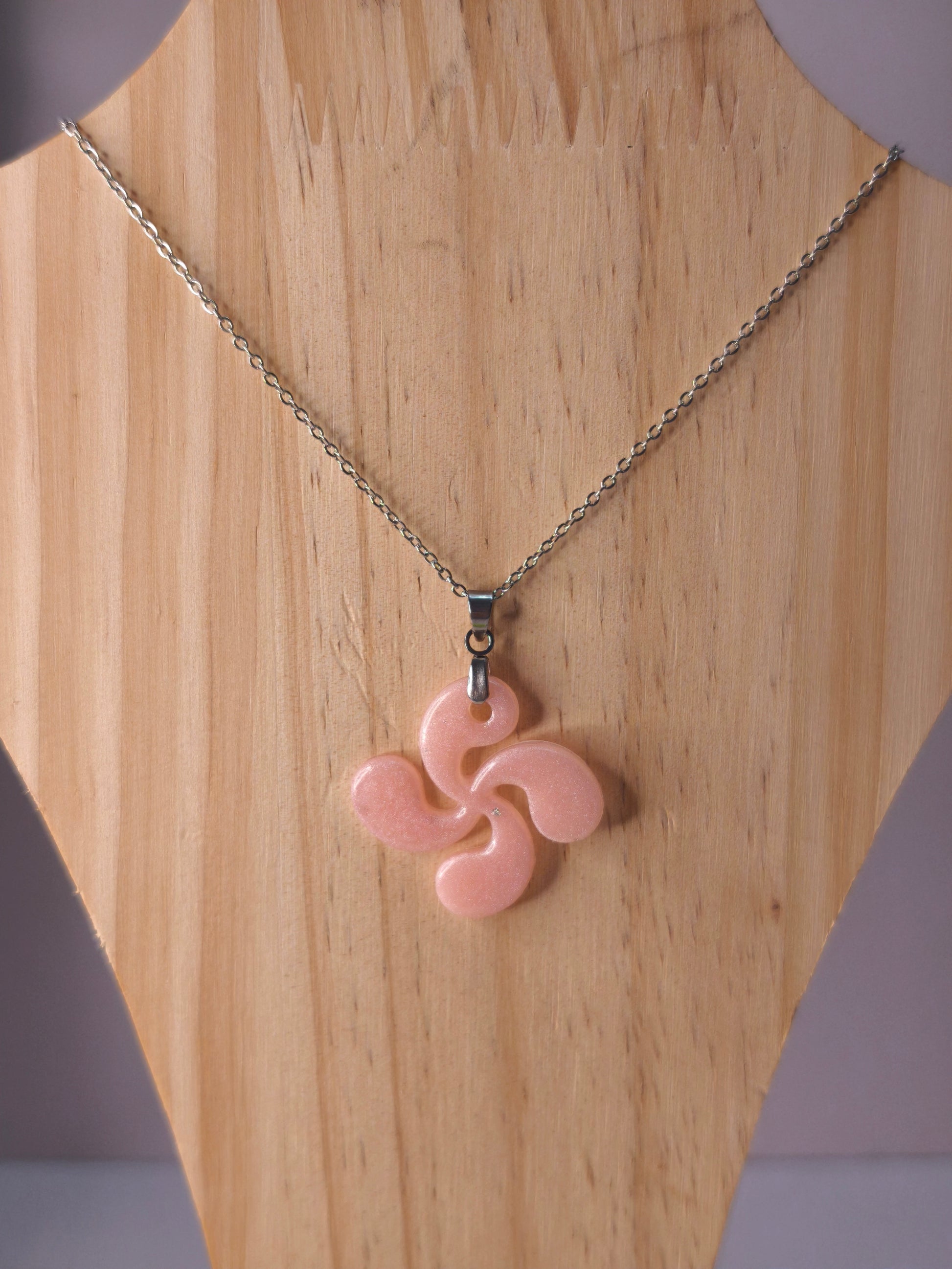 Un collier rose pâle qui suspend la Croix Basque près du cœur, pour un style poétique et lumineux inspiré de Baigorri