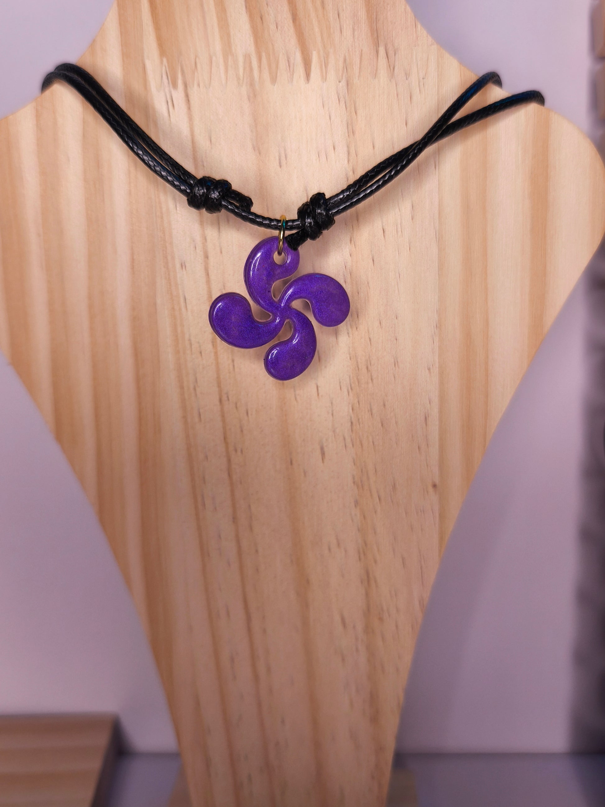 Un collier violet qui suspend la Croix Basque près du cœur, pour garder avec soi la bienveillance et la force tranquille d’Ossès