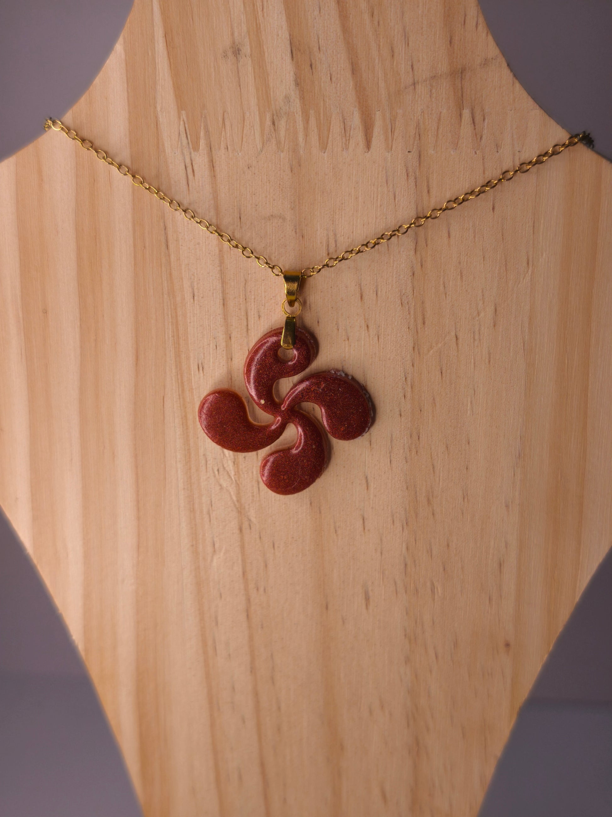 Un collier rouge brun qui suspend la Croix Basque près du cœur, pour porter avec soi la force et la chaleur d’Irouléguy
