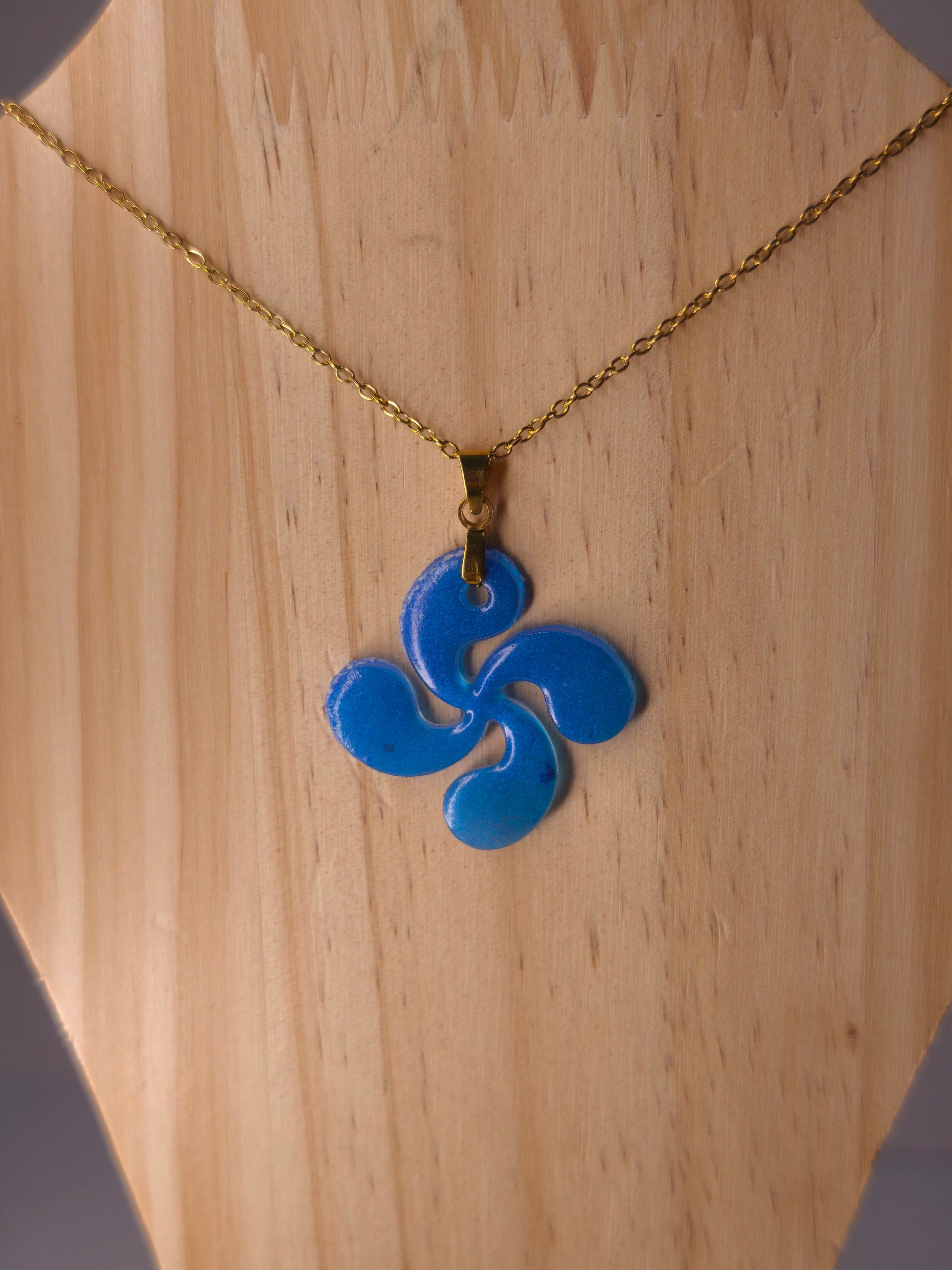 Un collier bleu océan qui suspend la Croix Basque près du cœur, pour porter avec soi la profondeur, la sérénité et la beauté d’Ustaritz