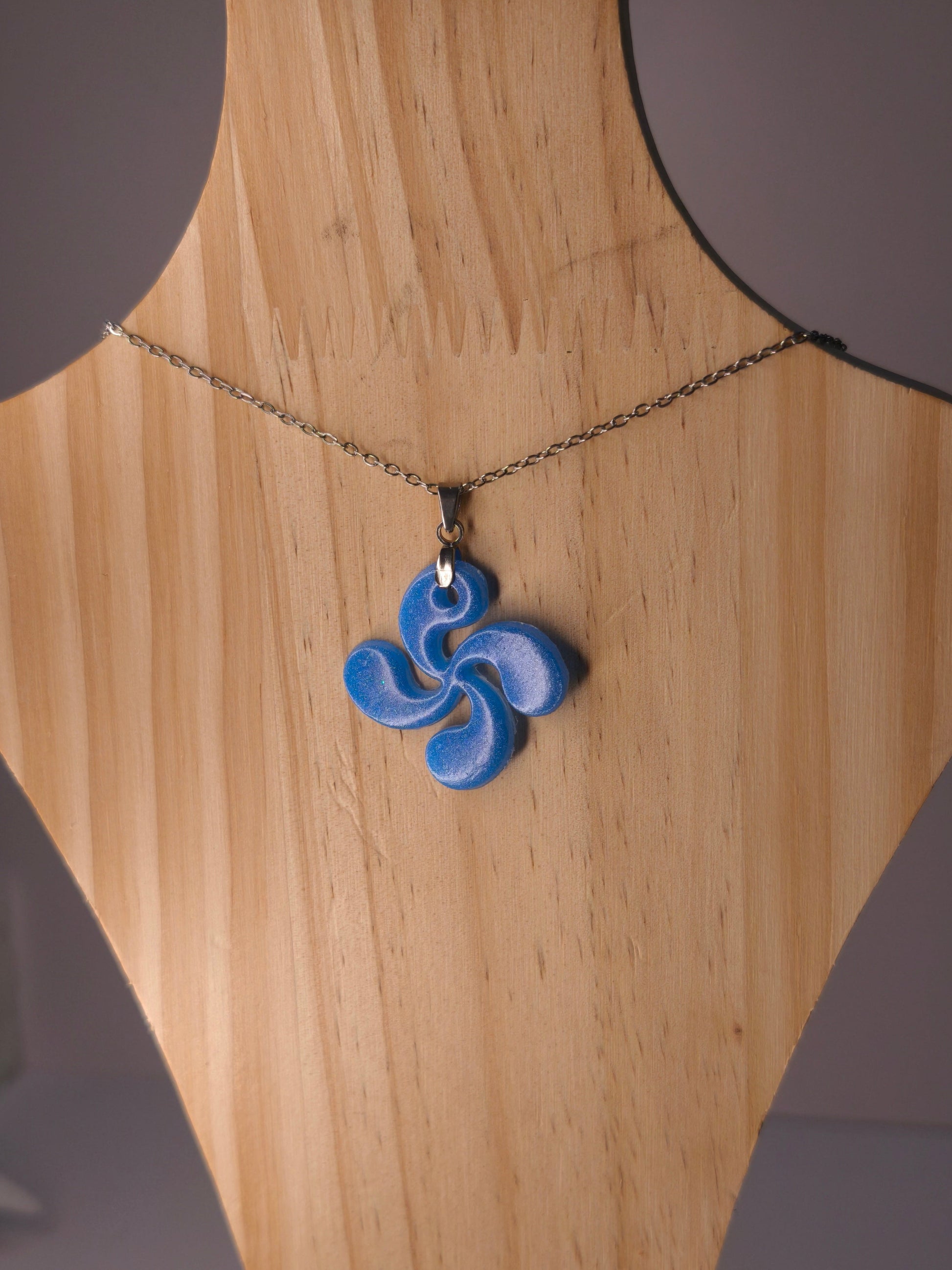 Le pendentif croix basque en bleu illumine le port de tête d’une note authentique et lumineuse