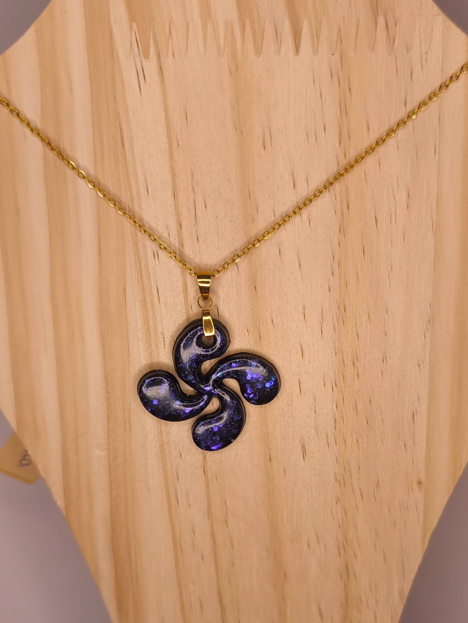 Le pendentif croix basque en noir à paillettes sublime le port de tête d’une touche élégante et lumineuse
