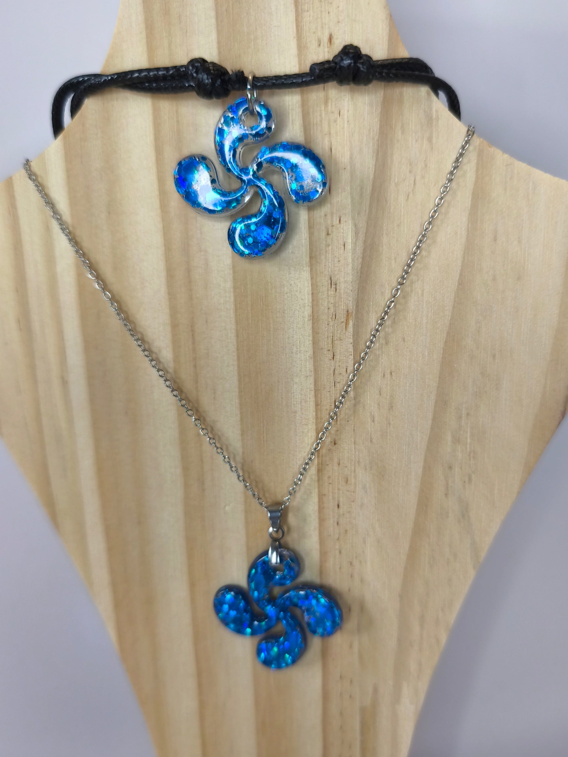 Un collier bleu foncé qui suspend la Croix Basque près du cœur, pour garder toujours avec soi l’inspiration et l’amour qu’elle m’a donnés