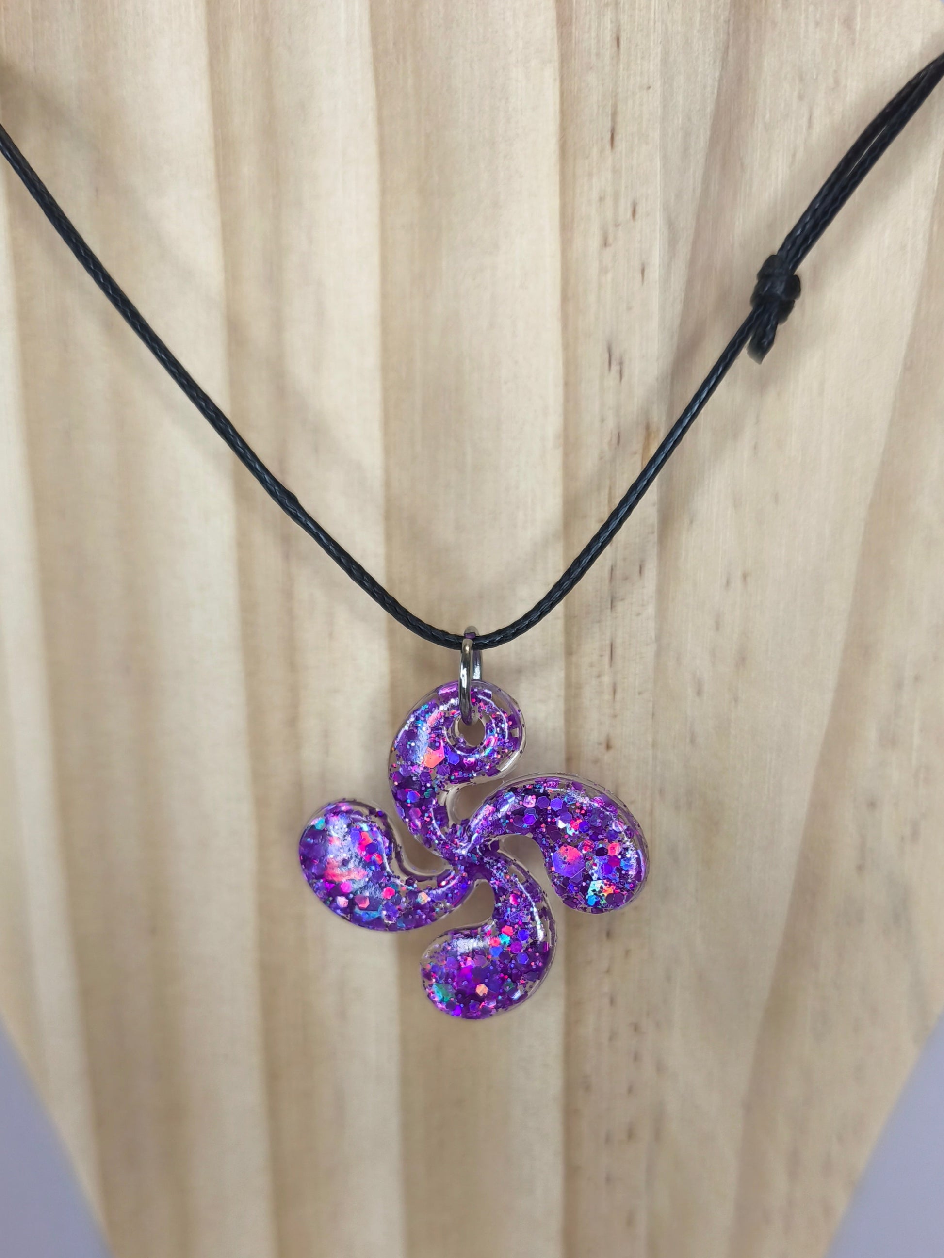 Un collier violet à paillettes qui suspend la Croix Basque près du cœur, pour garder toujours un éclat de rêve et de mystère avec soi.