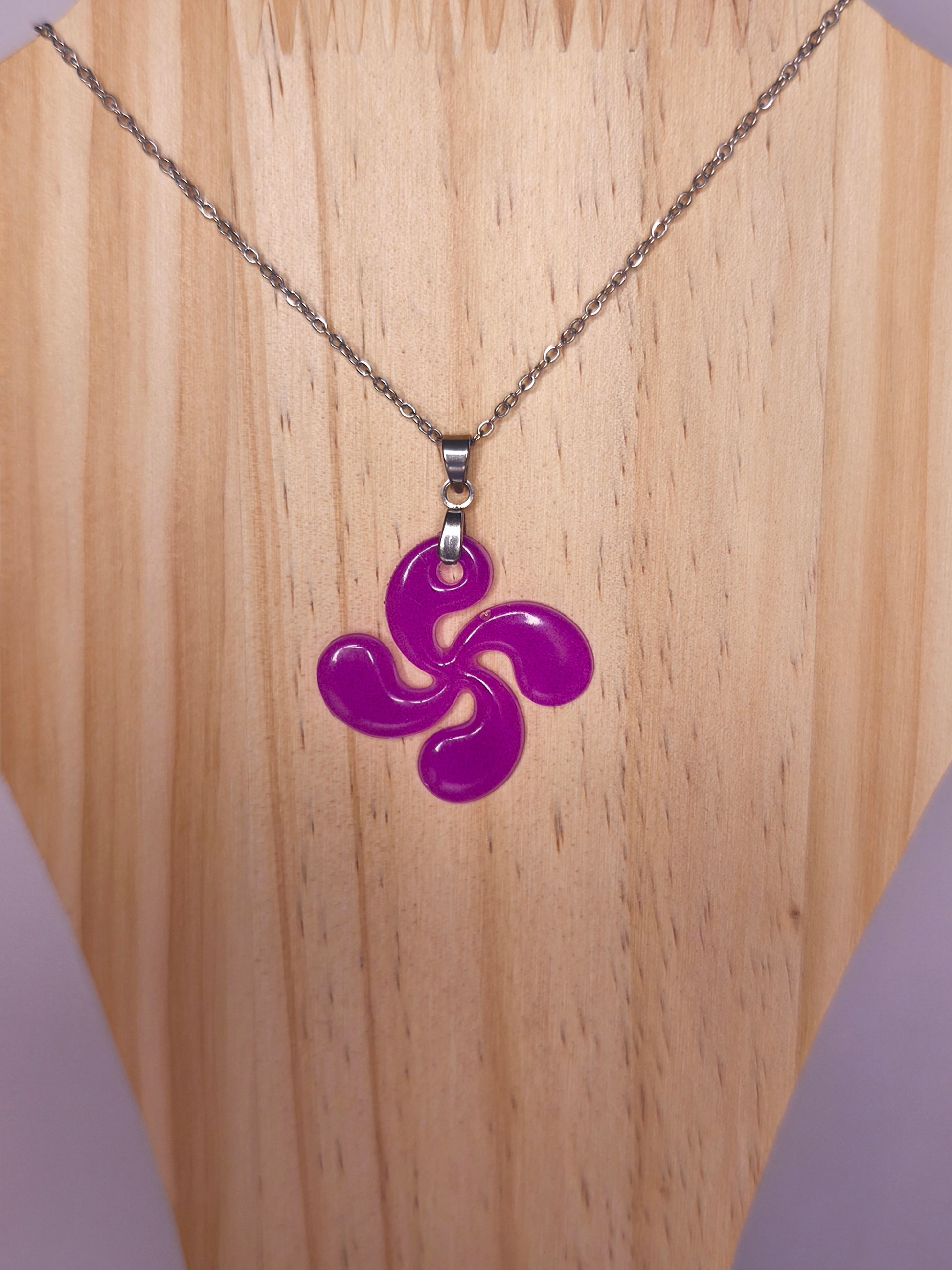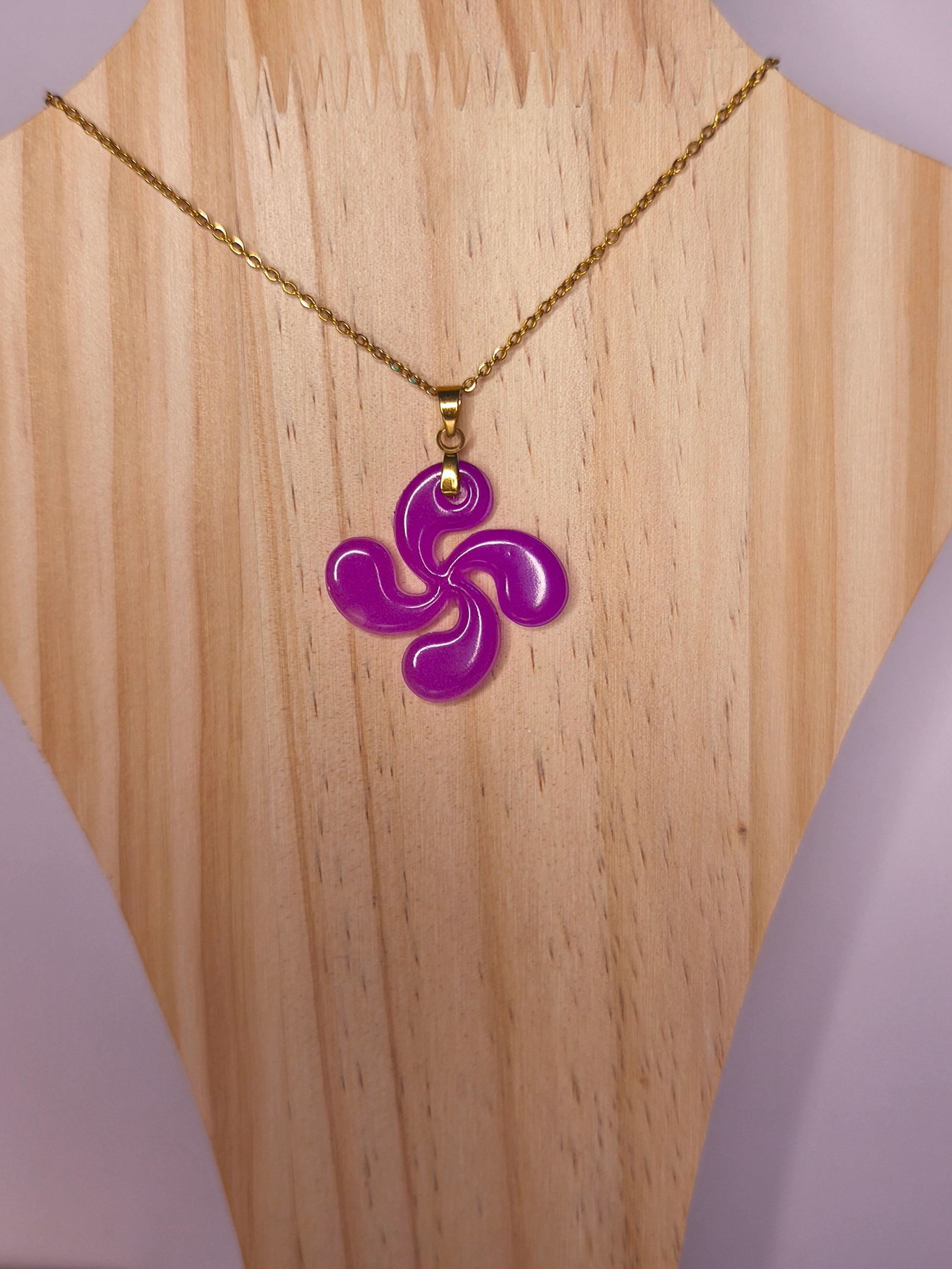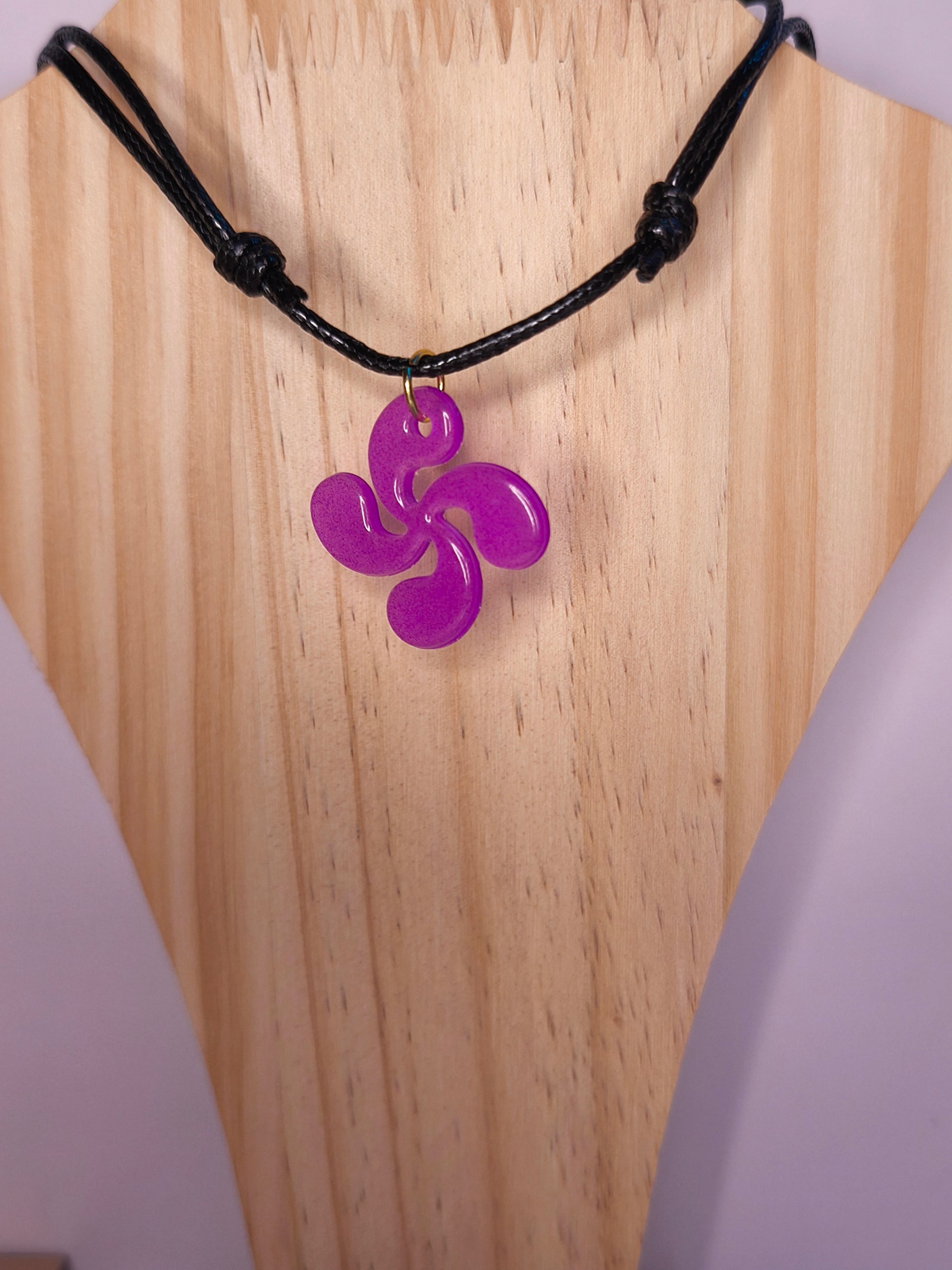 Un collier violet phosphorescent qui suspend la Croix Basque près du cœur, pour porter avec soi la lumière et la poésie de Saint-Jean-le-Vieux