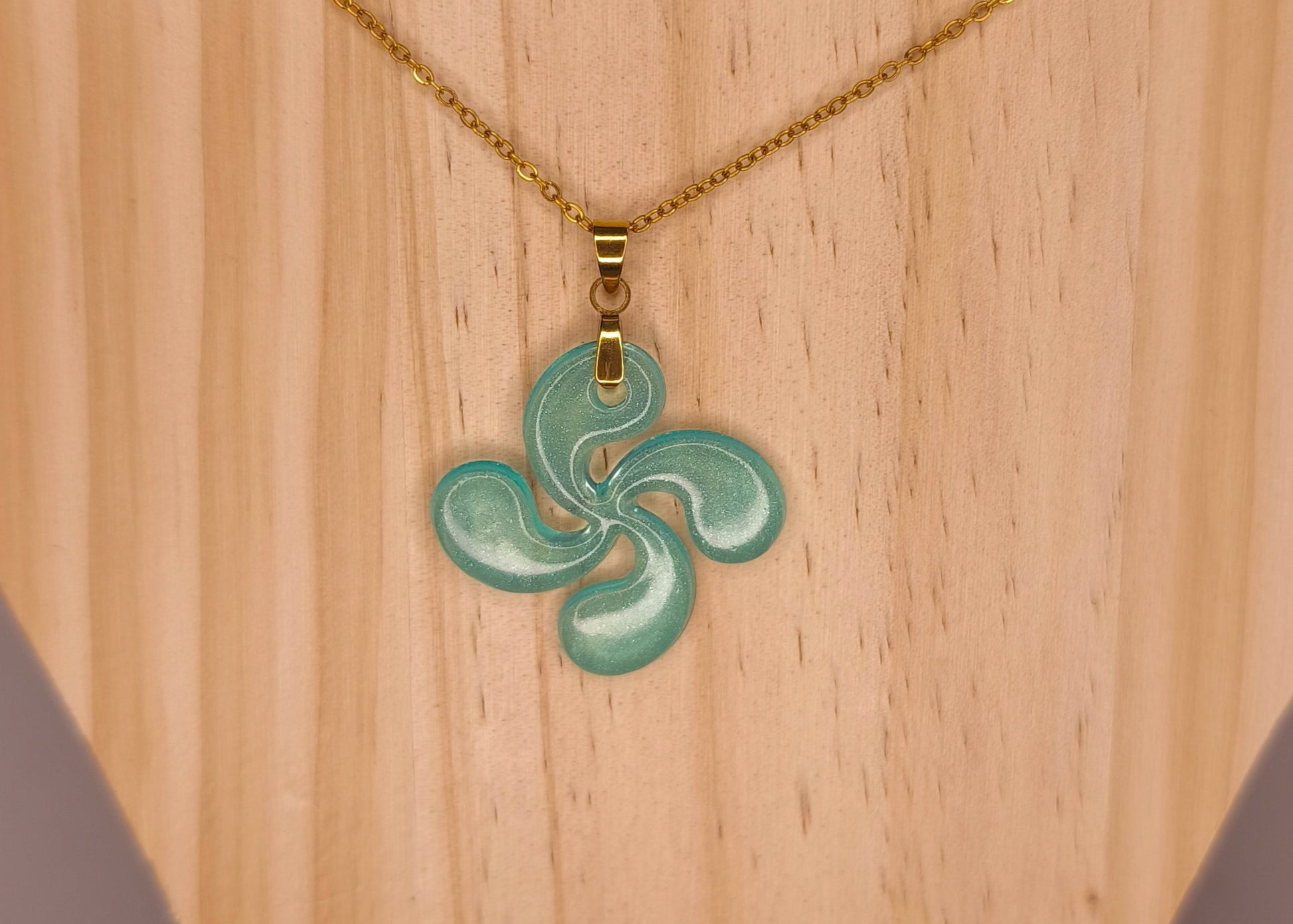 Le pendentif croix basque en vert illumine le port de tête d’une touche lumineuse et poétique