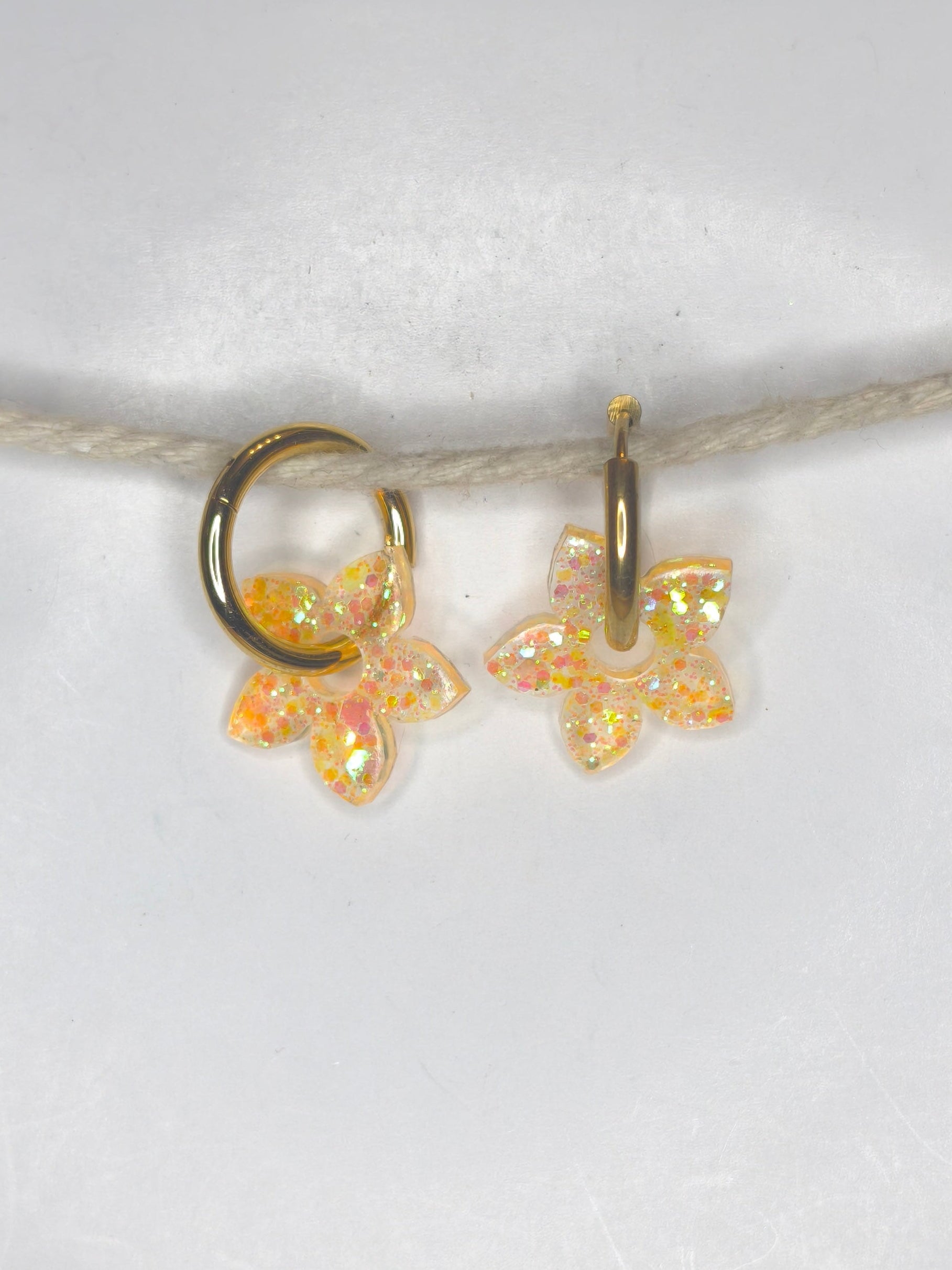 Un tiaré vibrant aux pétales orangés, illuminé de phosphorescence pour briller subtilement dans l’obscurité.