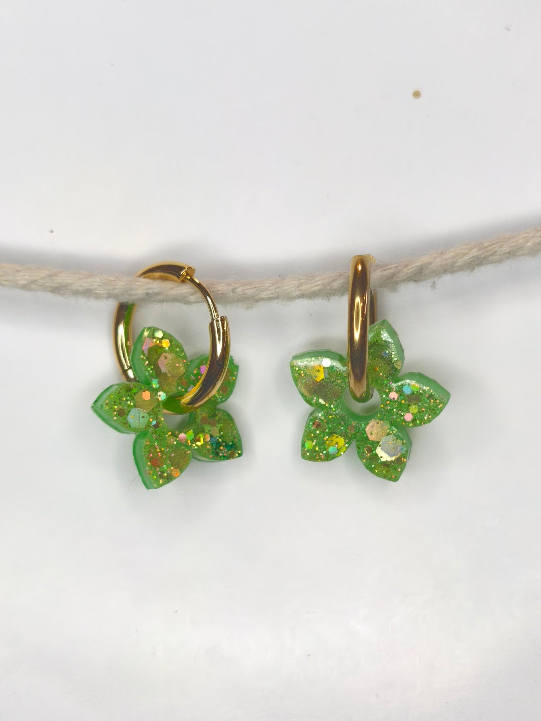 Un tiaré aux pétales vert profond, sublimé de paillettes dorées, rappelant les couchers de soleil sur les montagnes basques.
